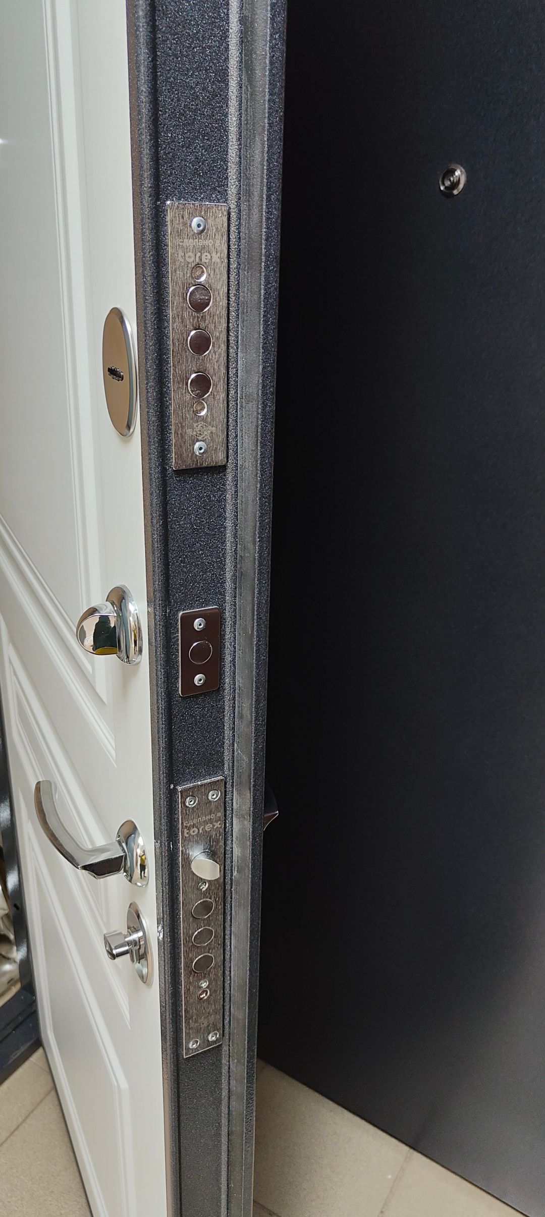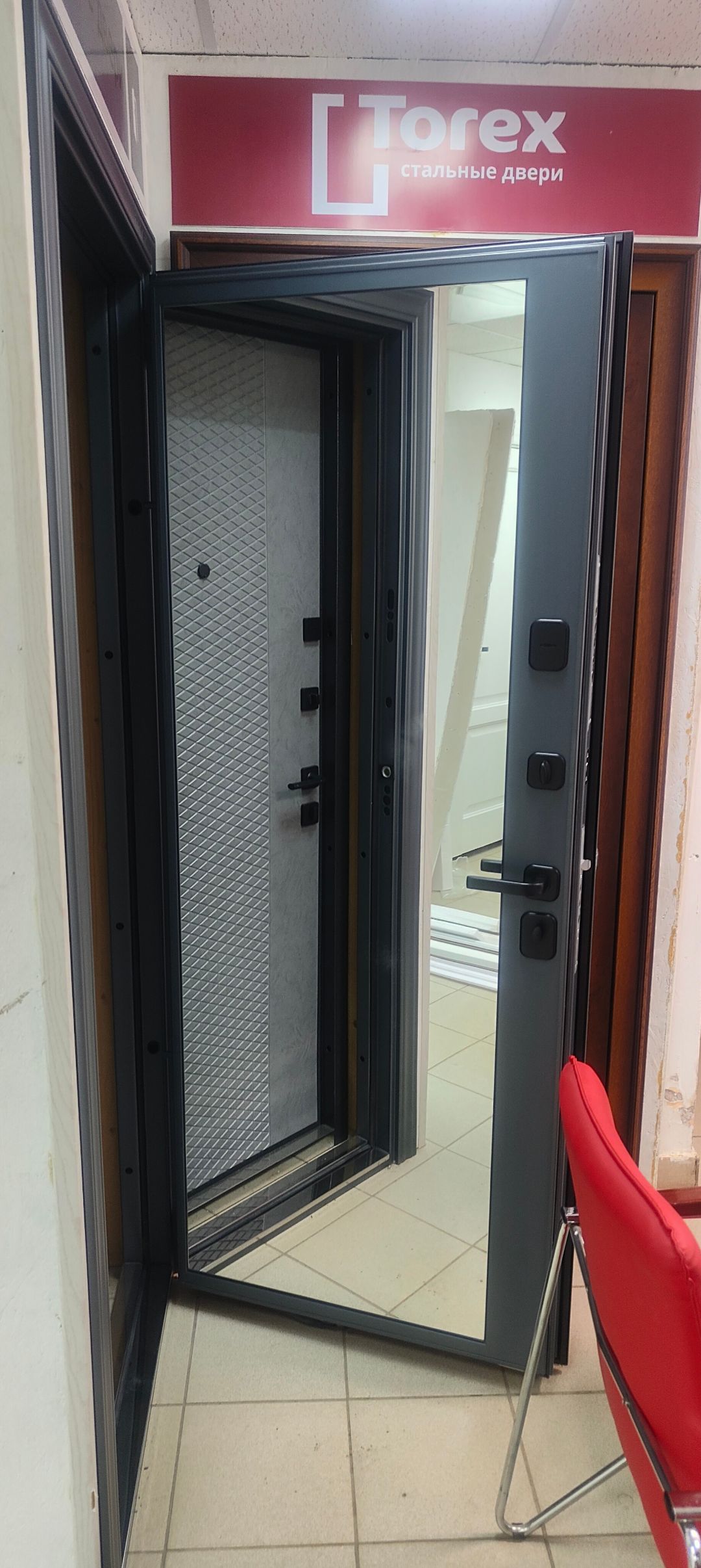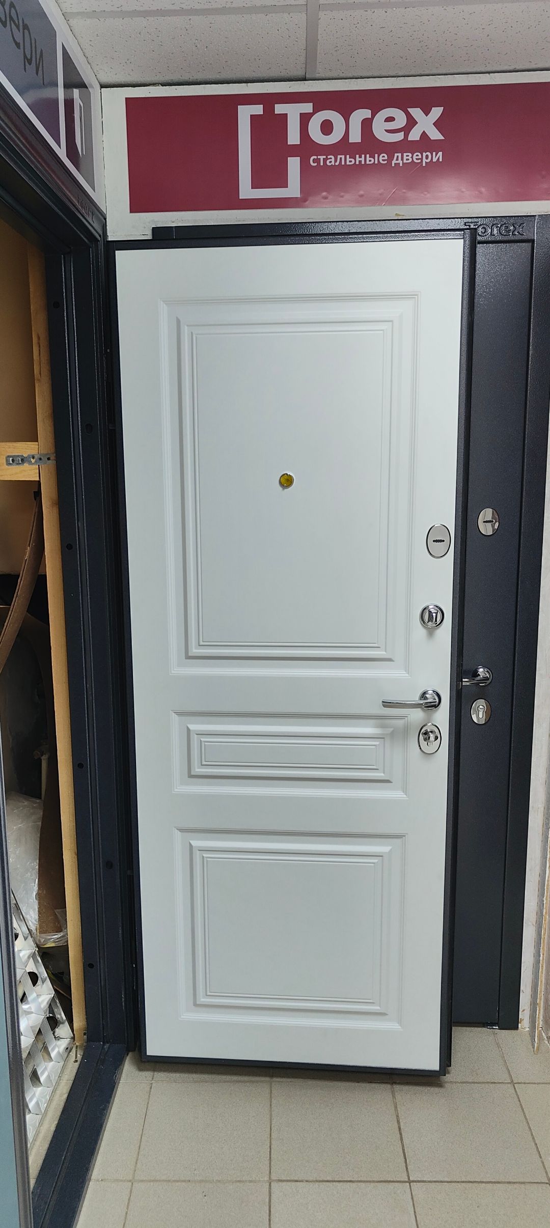 Продам Дверь Torex Delta PRO MP, 860*2050h по коробу, крепкое полимерно-порошковое покрытие "темно-серый букле графит", снаружи штамп на металле RGSO. Внутри классическая панель СК67 в цвете бьянко. Дверь толщиной 70мм, 2 уплотнителя, 2 разносистемных замка, фурнитура цвета хром, толщина металла 1,5мм. ЛЕВАЯ в заводской упаковке СО СКЛАДА, Правая с выставки на фото ПРОДАНА. Розничная цена двери 27900 рублей. Продается за 20000 рублей.
