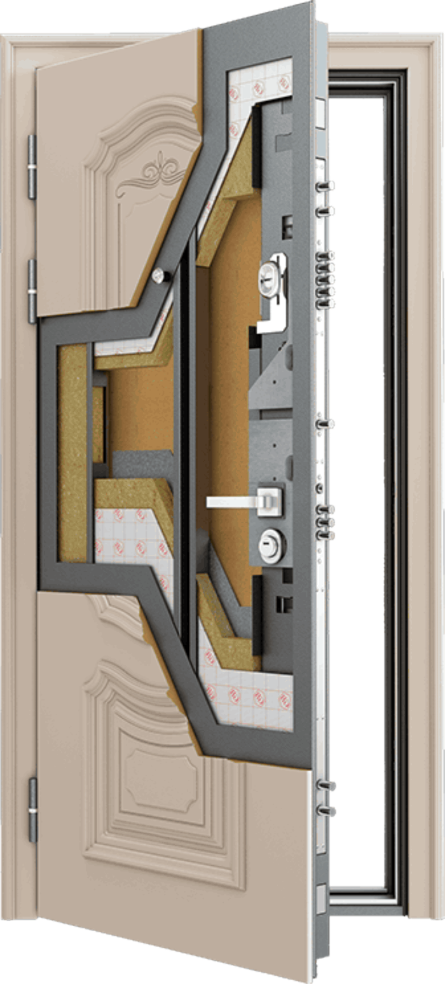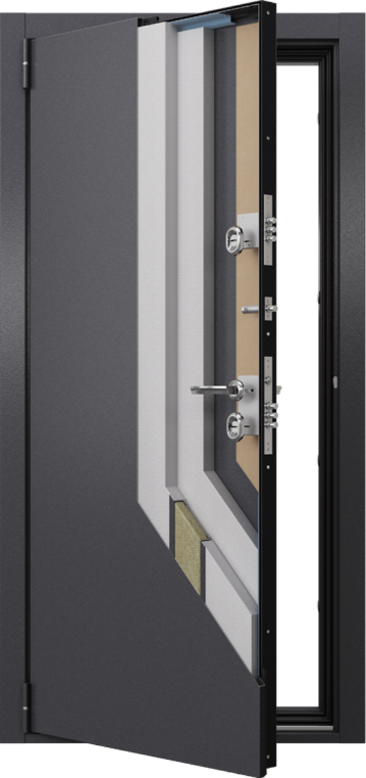 2 слоя пенополистирола помогают сохранить тепло и комфортную атмосферу у вас дома. Минеральная плита в ребрах жесткости обеспечивает дополнительную теплоизоляцию. 3 контура резинового уплотнителя не пропускают сквозняки, пыль и шум с улицы. Сувальдные замки с подпружиненными шторками исключают возникновение мостиков холода — участков конструкции с высокой проводимостью тепла.