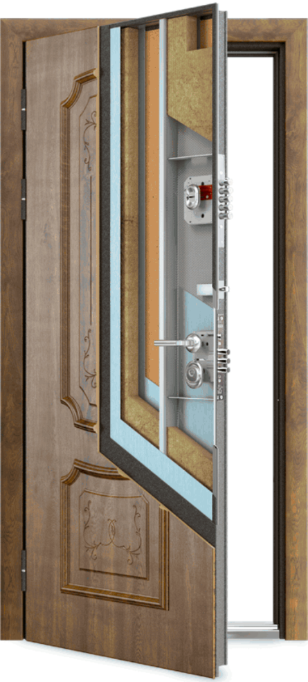 Замковая система класса "премиум", дополнительные точки запирания и броненакладки на замки обеспечивают максимальный уровень защиты от интеллектуальных и силовых методов взлома.
