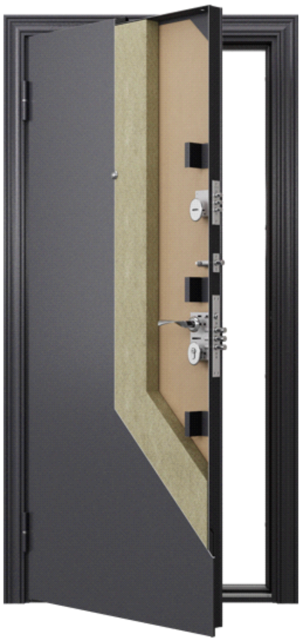 2 слоя пенополистирола помогают сохранить тепло и комфортную атмосферу у вас дома. Минеральная плита в ребрах жесткости обеспечивает дополнительную теплоизоляцию. 3 контура резинового уплотнителя не пропускают сквозняки, пыль и шум с улицы. Сувальдные замки с подпружиненными шторками исключают возникновение мостиков холода — участков конструкции с высокой проводимостью тепла.